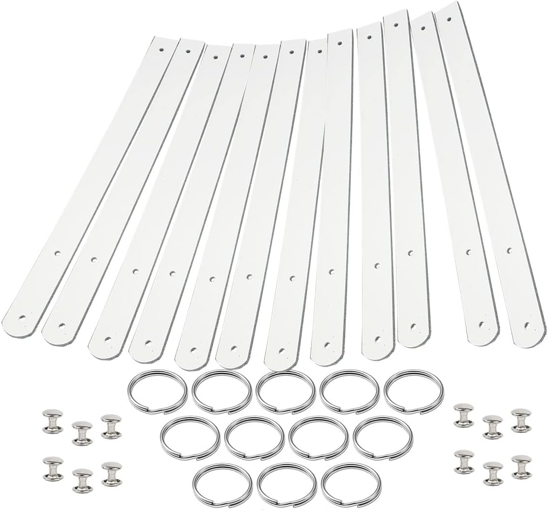 12 Pack latigo leather keychains blank - 18 colors available The product may be customized by customers using their own equipment (e.g., laser engraving, hot stamping, or foil stamping tools). The listing does not offer, advertise, or include any laser engraving equipment Looking for the perfect leather keychain kit for engraving, hot stamping, or promotional gifts? Our 12 Pack Leather Keychains Kit is exactly what you need to create stunning, professional-grade key fobs quickly and easily. Each DIY leather keychain kit – 12 pack comes with pre-cut latigo leather keychains, ready for customization with laser engraving, machine engraving, hot foil stamping, and more. Hardware is included with each pack.These are not for hand stamping, making them ideal for precision tools like CO2 laser engravers and hot foil machines. This bulk leather keychains kit for promotional gifts includes 12 premium leather keychain blanks, available in 18 bright leather colors—a vibrant mix perfect for small business makers, crafters, or event organizers. Whether you’re selling at a local market, creating personalized corporate giveaways, or hosting a DIY workshop, these blank leather keychains for hot stamping and laser engraving offer unbeatable versatility and quality. Each DIY leather keychains pack contains 12 keychain blanks cut to a size of 5/8" wide x 8" long, 12 split rings (1 1/8" ID) and 12 sets of double cap rivets. These engraving-ready leather key rings blank feature smooth edges and finished surfaces, designed to hold detail and color beautifully during the engraving or stamping process. Our leather keychains for engraving are made from real latigo leather—firm, strong, and consistent in finish—far superior to cheap PU imitations. Whether you're making DIY key fobs for small business, custom gifts, or event favors, you’ll love the results. This multi-color (18 pack) leather keychain pack is perfect for adding variety to your product line or offering colorful customization options. With leather keychain blanks for foil stamping in so many shades, you’ll never run out of creative combinations. Choose this leather keychains DIY kit with hardware included and make your brand or project unforgettable with high-quality, customizable leather keychains designed for impact and built to last.
