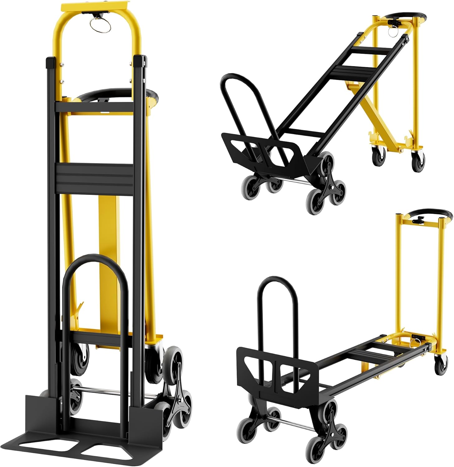 This hand truck excels as a stair climbing cart and stair dolly, allowing you to effortlessly navigate stairs without straining your back or risking damage to your items. Its heavy-duty construction ensures durability and long-lasting performance, making it the perfect appliance dolly for heavy loads.The convertible design lets you switch between a traditional hand truck and a flat dolly platform, providing flexibility to handle various types of cargo with ease. Whether you need a stair climber cart for bulky boxes, appliances, or equipment, this stair climbing hand truck is engineered to deliver superior stability and control.Key Features:- Heavy Duty Hand Truck with 800 lbs capacity for transporting large and heavy items- Stair Climbing Dolly design enables smooth and safe movement up and down stairs- Convertible Hand Truck transforms easily between upright and platform modes- Durable Aluminum Frame offers strength without adding excessive weight- Ideal for Home, Office, Warehouse, and Supermarket use- Equipped with robust wheels designed for stair climbing and rough surfacesUpgrade your moving and transport tasks with this reliable, multi-functional hand truck. Experience the convenience of a stair dolly that combines strength, versatility, and ease of use in one compact, lightweight package. Make your next move safer and more efficient with the 3 In 1 Convertible Aluminum Hand Truck Dolly Cart.