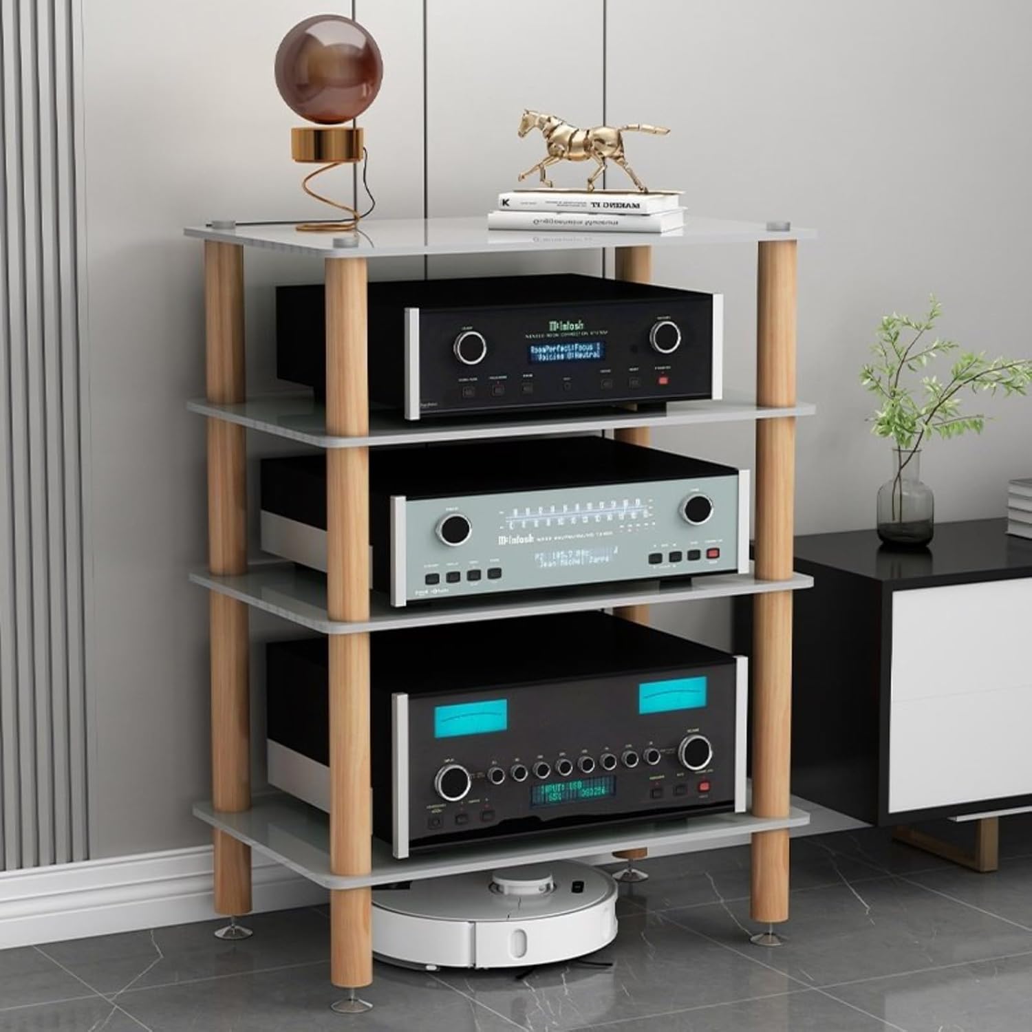 Product DescriptionThis multi-layer amplifier rack is designed for audiophiles and high-end home audio-visual systems. It features 8mm thickened tempered glass shelves, sturdy solid wood columns, and metal anti-vibration feet, effectively reducing resonance and vibration interference. The multi-layer open design is compatible with a variety of audio equipment and promotes heat dissipation, extending the lifespan of your devices. Suitable for various settings such as living rooms, home theaters, and studies.Product SpecificationsProduct Name: Audio-Video ShelvingMaterial: 8mm Tempered Glass + Solid Wood Columns + Metal FeetStructure Type: Open ShelfInstallation Method: Self-assemblyApplicable Devices: Amplifiers, decoders, CD players, turntables, media players, etc.Usage Scenarios: Living room, home theater, study, studioPackage Contents: Audio Rack x 1
