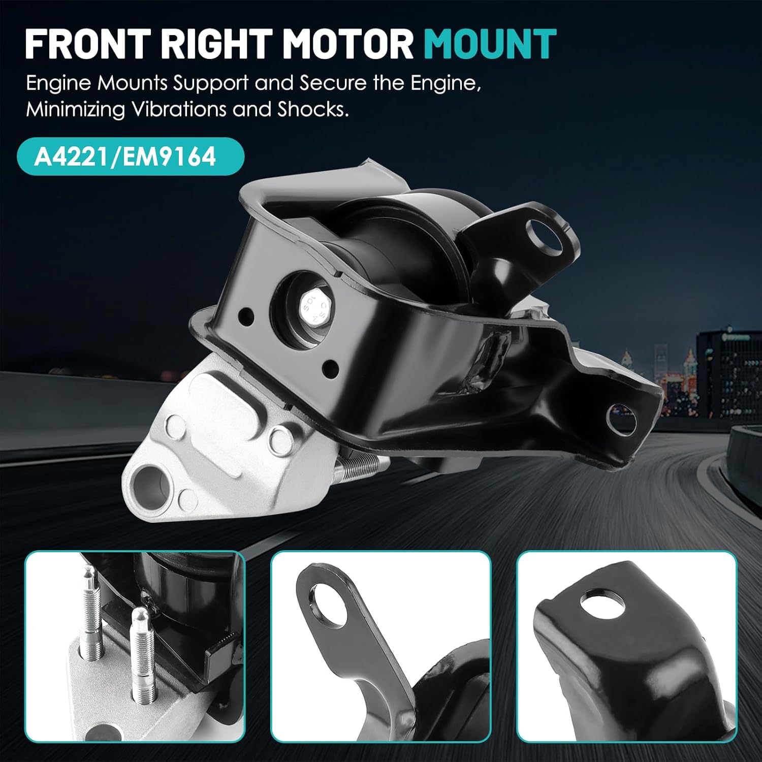 Drive Smoothly with Our Engine Motor Trans Mount SetPart Number:A4220, A4219, A4218, A4221, 9158, 9164, 9155, 9163,EM9155, EM9158, EM9164, EM9163,123050D023, 1236122030, 1236122040, 123050D022,88973356, 88974794, 88969075, 88969089, 88969090123710D110, 123710D120, 123720D100, 123720D110.Advantage:Brand New Motor Mount, Direct Replacement.High-Quality Finishes Resist Corrosion.Tested & Certified to Meet or Exceed OEM Quality Standards.Increased Thermal Resistance, Noise Reduction And Prevents Vibration.Superior Rubber-To-Metal Bond ensures Maximum Life & Performance.Replacement Of All Engine and Transmission Mounts is Recommended to Restore Original Dampening Of Drivetrain Components.Compatibility:Compatible with Pontiac:2003-2008 replacement for Pontiac Vibe L4 1.8L, All Body Style Automatic TransmissionCompatible with Toyota:2003-2008 replacement for Toyota Corolla L4 1.8L, All Body Style Automatic Transmission2003-2008 replacement for Toyota Matrix L4 1.8L, All Body Style Automatic TransmissionNote: This list is a sample of this part's compatible cars.Please check whether the component is suitable for your vehicle before purchasing to ensure matching.Package Included—Engine Motor Trans Mount Set of 4:1x Front Motor Mount # A4219, 9158, EM91581x Front Right Motor Mount # A4221, 9164, EM91641x Rear Motor Mount # A4220, 9155, EM91551x Transmission Mount # A4218, 9163, EM9163Engine Motor Mount Set Feature:Function: Ensures stable engine and transmission alignment, reducing vibration and noise.Material: High-quality rubber and metal components for durability and reliability, preventing product leakage, oil pressure and rubber cracking.Performance: Reduces engine and transmission wear, improving overall vehicle drivability.Design: Designed to meet OEM specifications for ease of installation.Improved Driving Comfort: Effectively fixes the engine, plays a good role in buffering and shock absorption, reduces noise and vibration, improving passenger comfort.Improved Stability: Minimises engine and transmission movement during acceleration and braking.【Restore Your Ride: If you notice any of these signs: 】①unusual noises;②engine misalignment;③difficult starting;④reduced performance, it may be time to replace your engine & transmission mounts today for a smoother, safer ride.