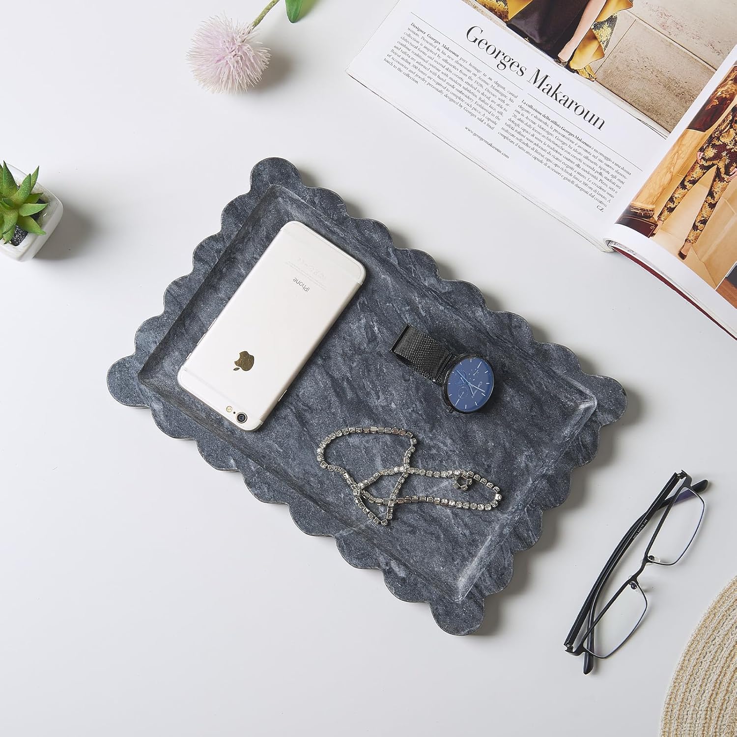 Introducing the Zilukar Scalloped Marble Collection, where impeccable organization meets artisanal elegance. This Tray and Holder Set isn't just about storage—it's about curating a lifestyle of refined beauty. A Harmonious Design Duo We've paired our iconic scalloped-edge marble tray with a versatile rectangular holder, creating a visually cohesive duo. The flowing curves of the tray contrast beautifully with the clean lines of the holder, offering a balanced aesthetic that elevates any interior style. Crafted from Nature's Artwork Sourced from premium Italian quarries, each piece of solid natural marble tells its own story through distinctive, organic veining. No two sets are exactly alike, granting you a unique piece of functional art. The substantial weight and cool, smooth touch are constant reminders of unparalleled quality. Transform Your Spaces The Ultimate Vanity: Create a spa-like experience. Arrange your daily fragrances, serums, and rings on the tray. Let the holder corral makeup brushes, tweezers, and eyeliner pencils. Your morning routine becomes a ritual of calm. The Refined Home Office: Command attention on your desk. Use the tray for staplers, notepads, and your phone. The holder keeps pens, scissors, and tools within reach yet impeccably orderly. Effortless Hospitality: Impress guests in the guest bathroom or entertain with style on a console table. The set beautifully holds guest essentials or acts as a stunning centerpiece for candles and decor. Built with Intelligence We design for real life. The discreet, high-quality non-slip pads ensure stability on any surface. Maintenance is refreshingly simple—just a quick wipe preserves the marble's luminous shine for a lifetime. The Zilukar Promise Our confidence in your satisfaction is as solid as our marble. Your purchase is protected by our 30-day guarantee. Elevate your everyday. Discover the joy of a perfectly organized, beautifully appointed space with the Zilukar Scalloped Marble Set.